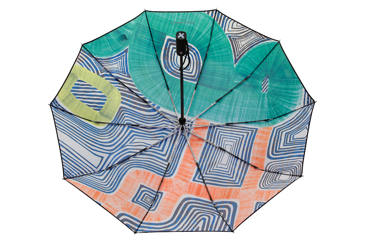 Premium Quality Auto Re-Enforced Telescopic Promotional Umbrella featuring TEN panels rendering it at least 25% stronger than the standard telescopic and about 10% larger. Fiberglass rib system, so nice and strong. Undo the tie wrap and press the button in the handle to open - this releases the spring and the canopy opens - press again to collapse it. Then manually push the handle and tip together to retract.