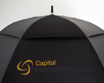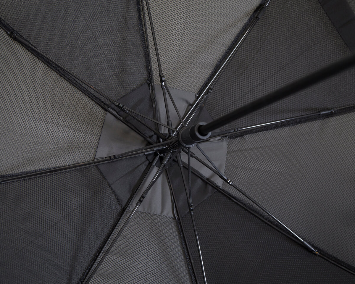 Premium quality, automatic opening golf Vented or Double layer canopy promotional umbrella, with interior mesh on the inside to stabilize the vents. Upgraded inner gel handle and embroidered sleeve.